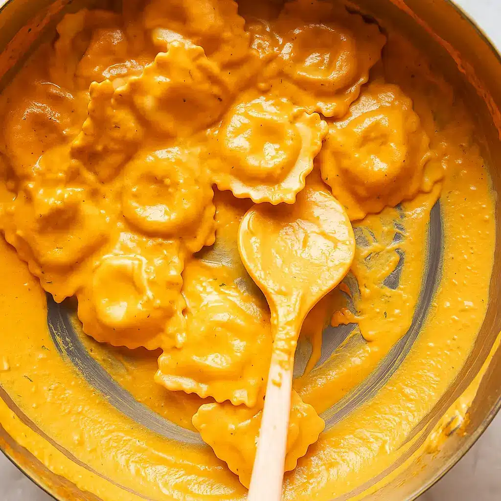 Creamy pumpkin ravioli coated in a rich orange sauce – 20 Minute Creamy Pumpkin Ravioli