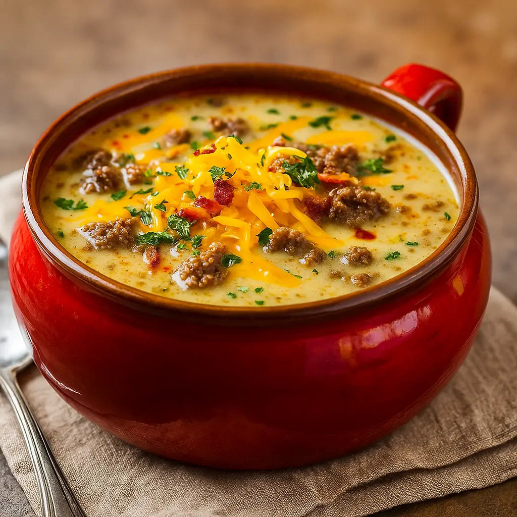 Imagine the flavor of a loaded baked potato, but in soup form — thick, savory, and a little indulgent. The ground beef adds hearty richness, while the cheddar melts into a creamy, velvety texture that coats every spoonful. There’s a hint of thyme that rounds out the flavor, giving it that homemade depth that canned soups just can’t touch.