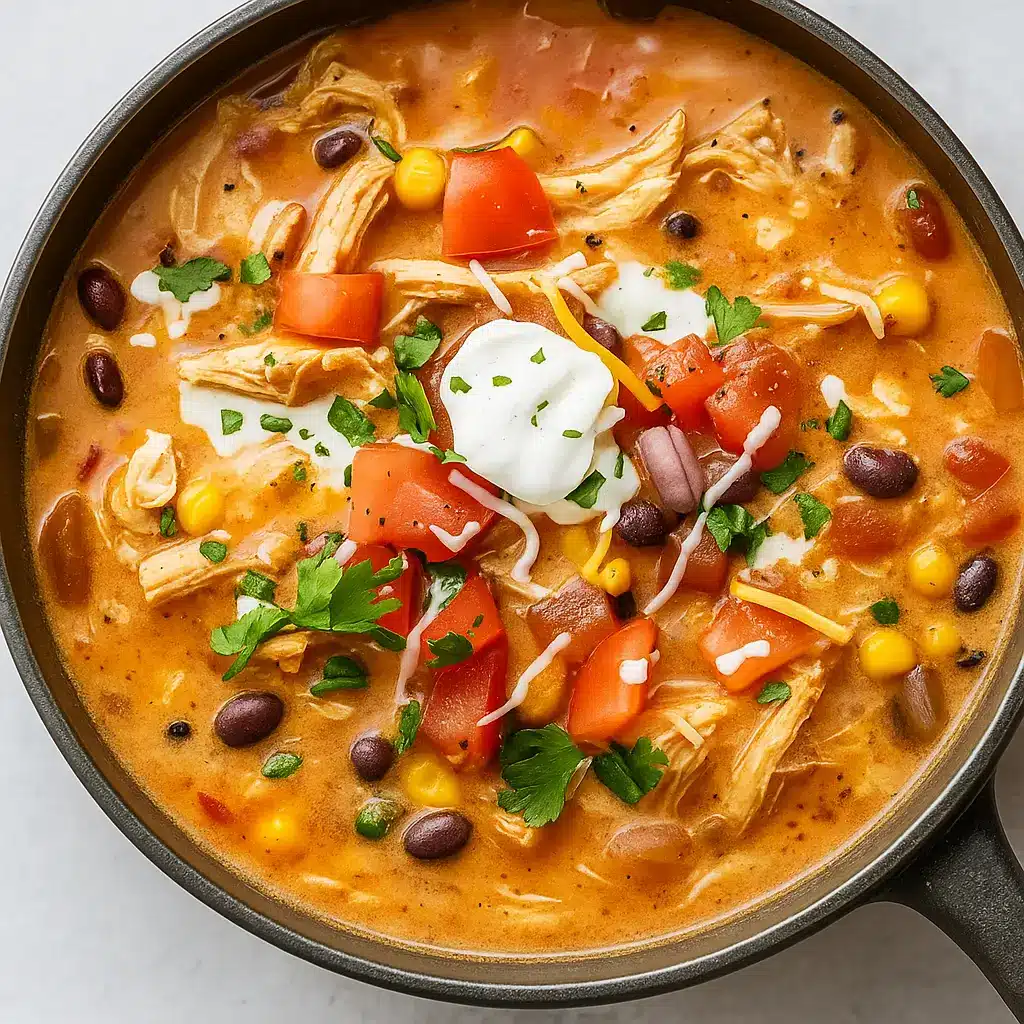 Imagine the bold flavors of a taco—spiced chicken, hearty beans, corn, and tomatoes—melted together in a creamy broth that feels like a warm hug. The cream cheese gives it richness, while the taco seasoning keeps things lively and a little zippy. Add some cilantro on top, and you’ve got freshness in every bite.