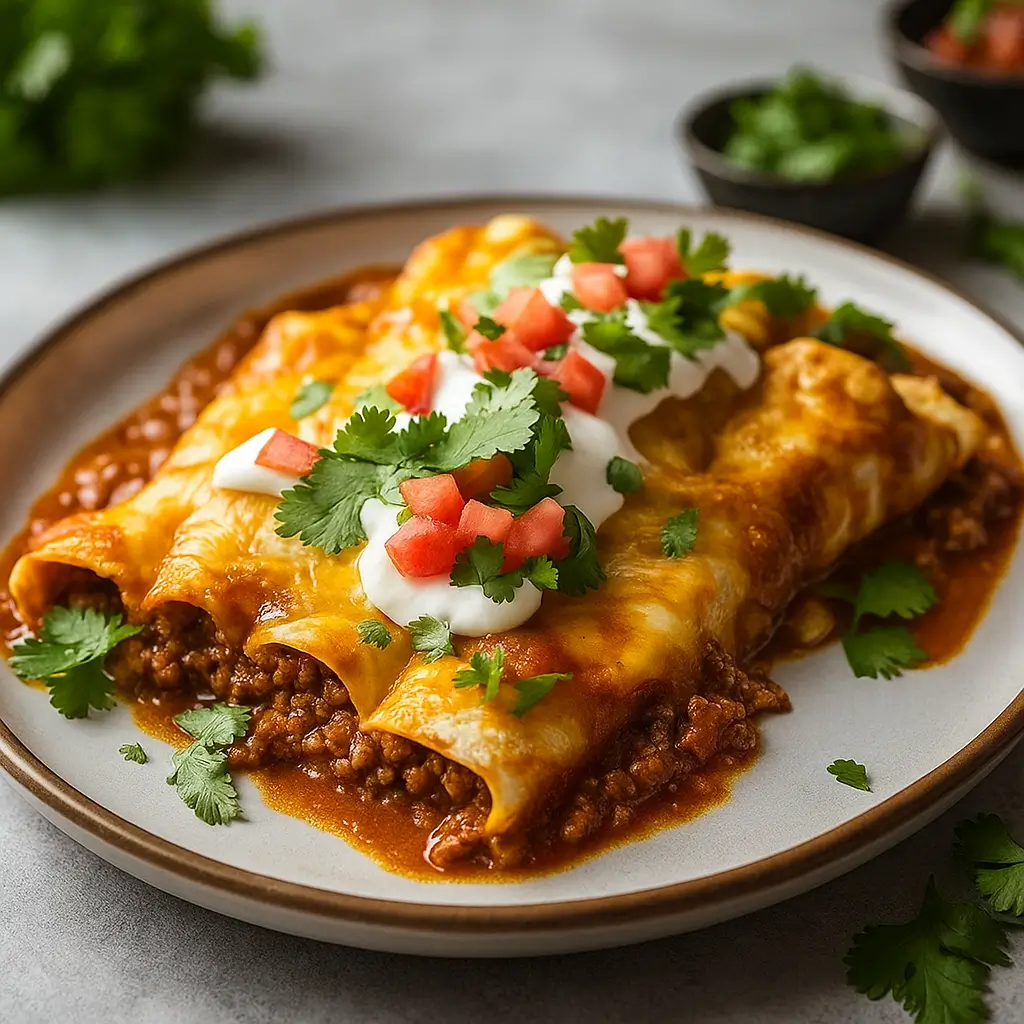 Now, for the final step-by-step Easy Ground Beef Enchiladas touch — the toppings. Spoon two enchiladas per plate, then add a generous dollop of sour cream, a sprinkle of fresh cilantro, or even diced avocado for a cool, creamy contrast. Want to make it a full meal? Pair them with a simple side like Easy Roasted Tomato Soup or Easy Glazed Carrots for color and balance.