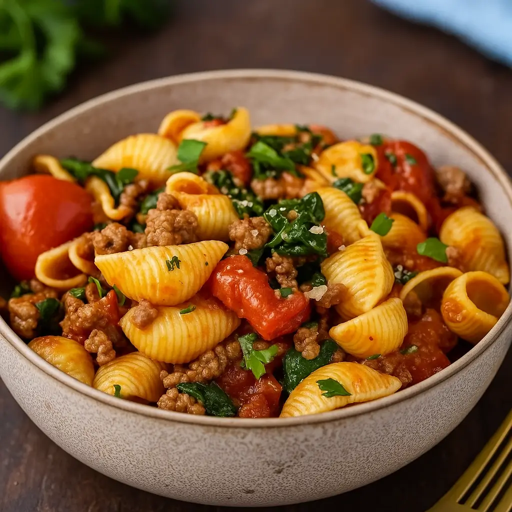 A healthy ground beef pasta dish packed with spinach, tomatoes, herbs, and creamy Parmesan sauce. Perfect for a balanced and hearty weeknight dinner.