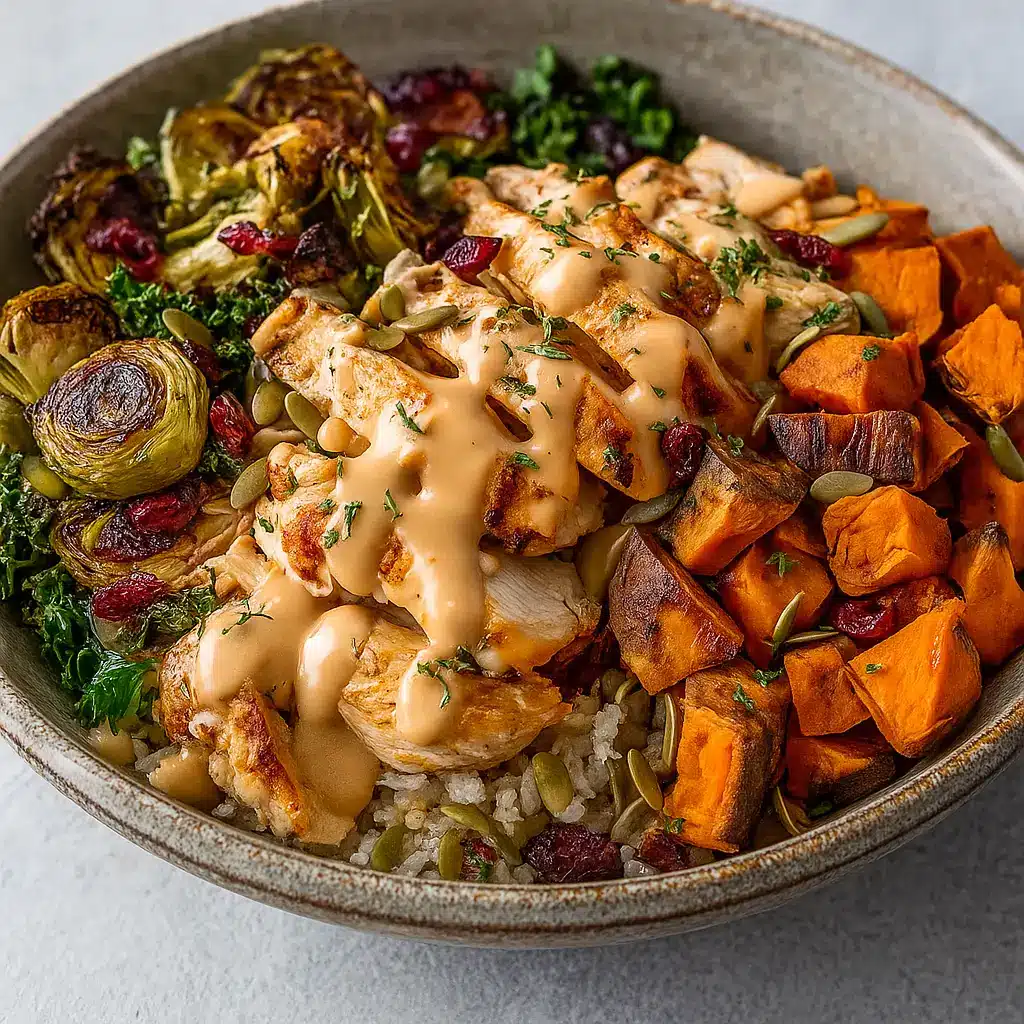Now for the best part — assembling your Maple Dijon Chicken Sweet Potato Bowls. Slice the rested chicken thinly against the grain for maximum tenderness. Divide the cooked rice evenly into four bowls, then spoon over your roasted sweet potatoes and Brussels sprouts. Lay the chicken slices on top, then drizzle with your maple-Dijon sauce. For a beautiful finishing touch, sprinkle on chopped pecans, a few dried cranberries, and some fresh parsley. The result? A picture-perfect meal that’s sweet, savory, and completely satisfying.