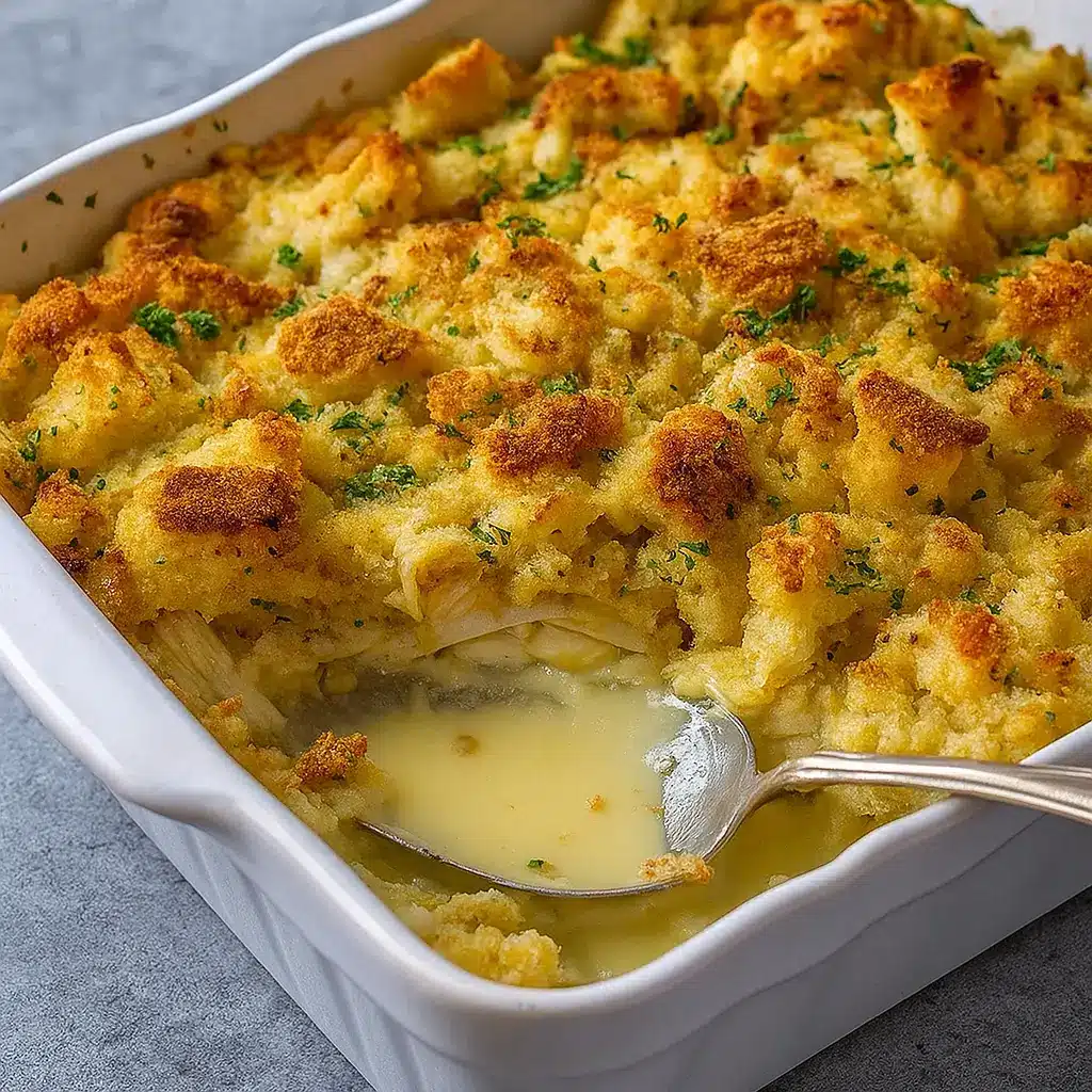Think Sunday dinner meets easy weeknight magic. The bottom layer of chicken becomes tender and juicy as it bakes in the creamy soup, while the stuffing on top turns golden and just a little crispy. Each bite has a perfect mix of soft, saucy goodness with that irresistible crunchy top.