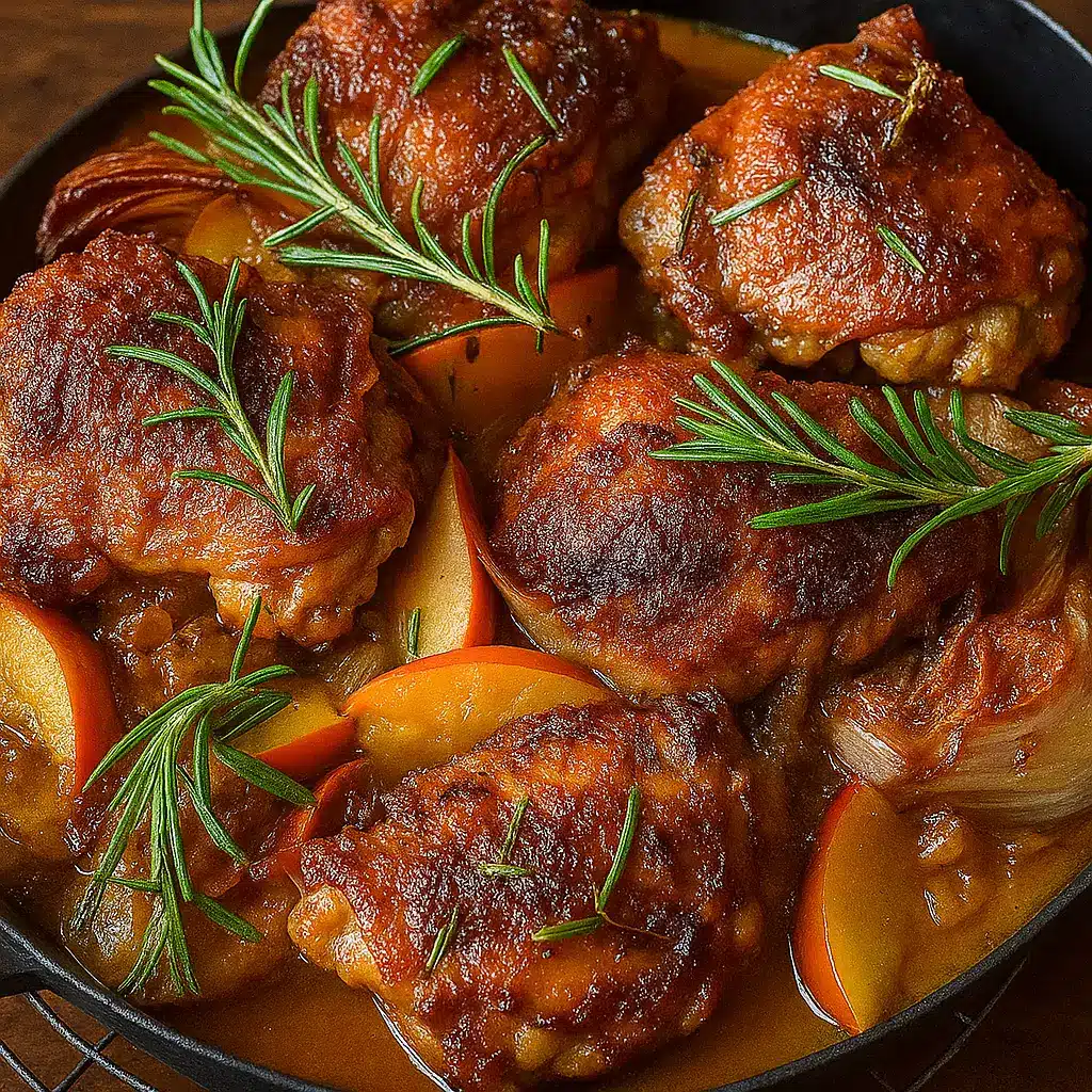 Imagine tender chicken thighs with golden, crispy skin paired with caramelized onions and apples. The rosemary adds that earthy, woodsy note, while apple cider and Dijon mustard swirl together into a tangy, buttery sauce. It’s cozy, slightly sweet, a little savory, and completely irresistible.